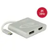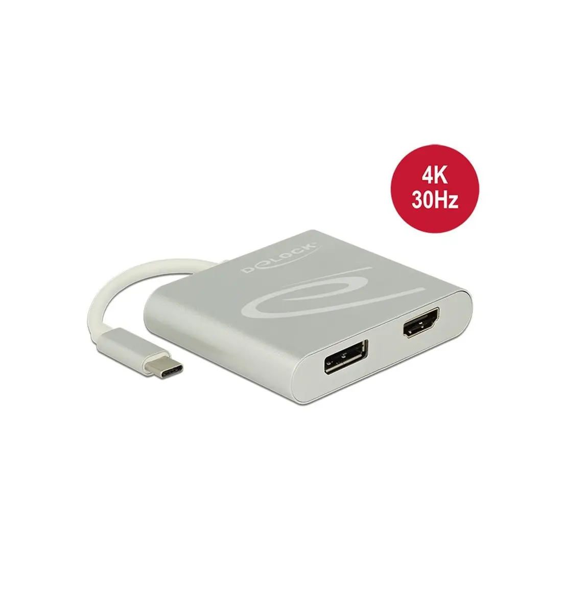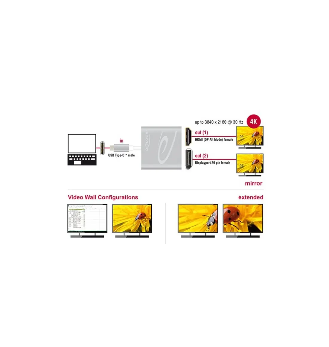 Este divisor de Delock es adecuado para la conexión de un monitor DisplayPort y un monitor HDMI a un ordenador con interfaz USB-C™ y soporte de modo alternativo de DisplayPort. Dos monitores se pueden operar simultáneamente en las salidas. La salida DisplayPort es compatible con modo dual (DP ++), de modo que los monitores HDMI o DVI pueden conectarse con un adaptador adecuado.