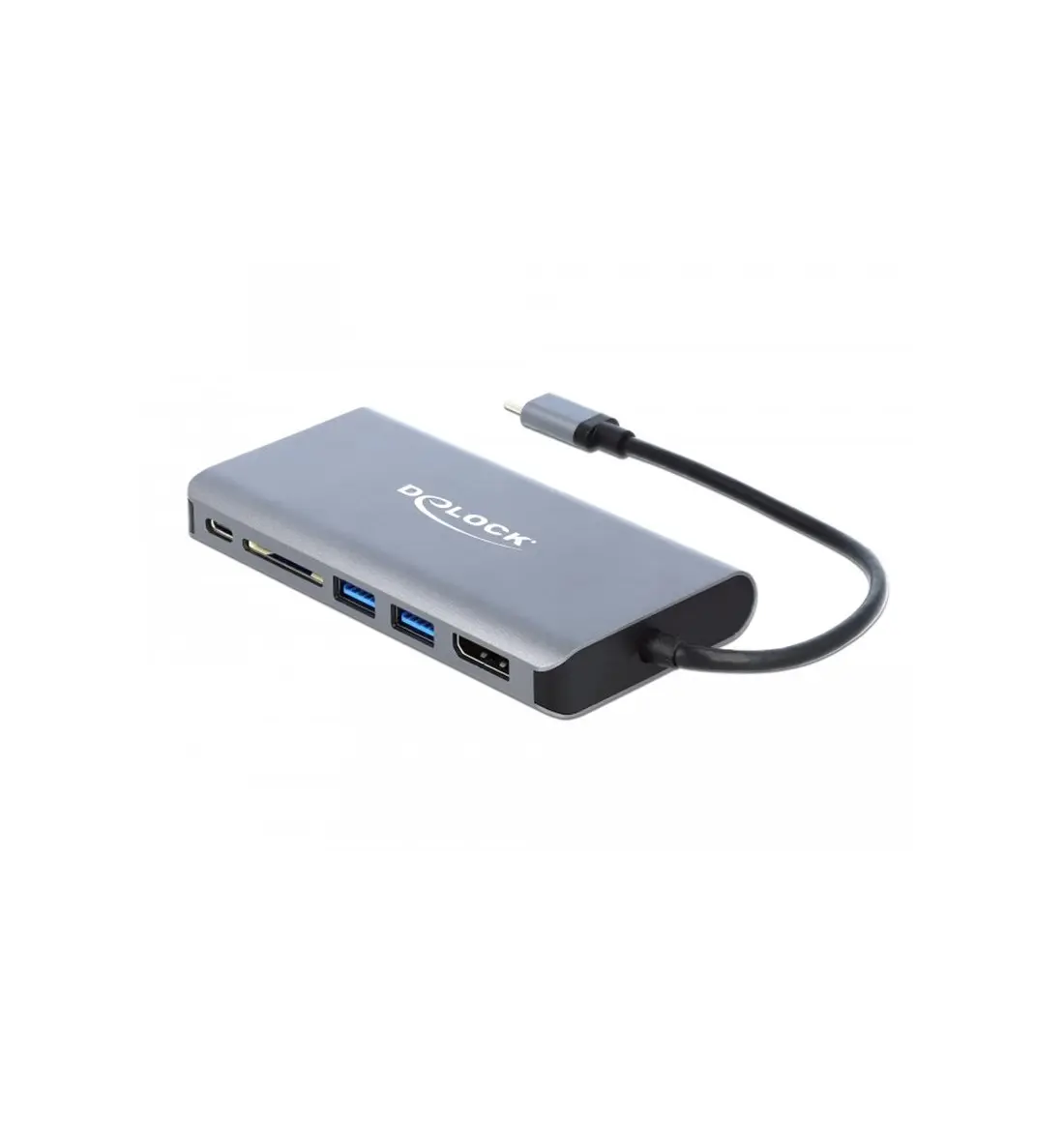 Esta base de acoplamiento de Delock se puede conectar a un equipo mediante un puerto Modo DP Alt USB-C™ o Thunderbolt™ 3 y proporciona diversas interfaces. Se pueden operar dos monitores simultáneamente en las salidas DisplayPort y HDMI. Los tres puertos USB incorporados permiten el uso de periféricos, y las conexiones para redes de Gigabit, así como un lector de tarjetas SD, completan las funciones.