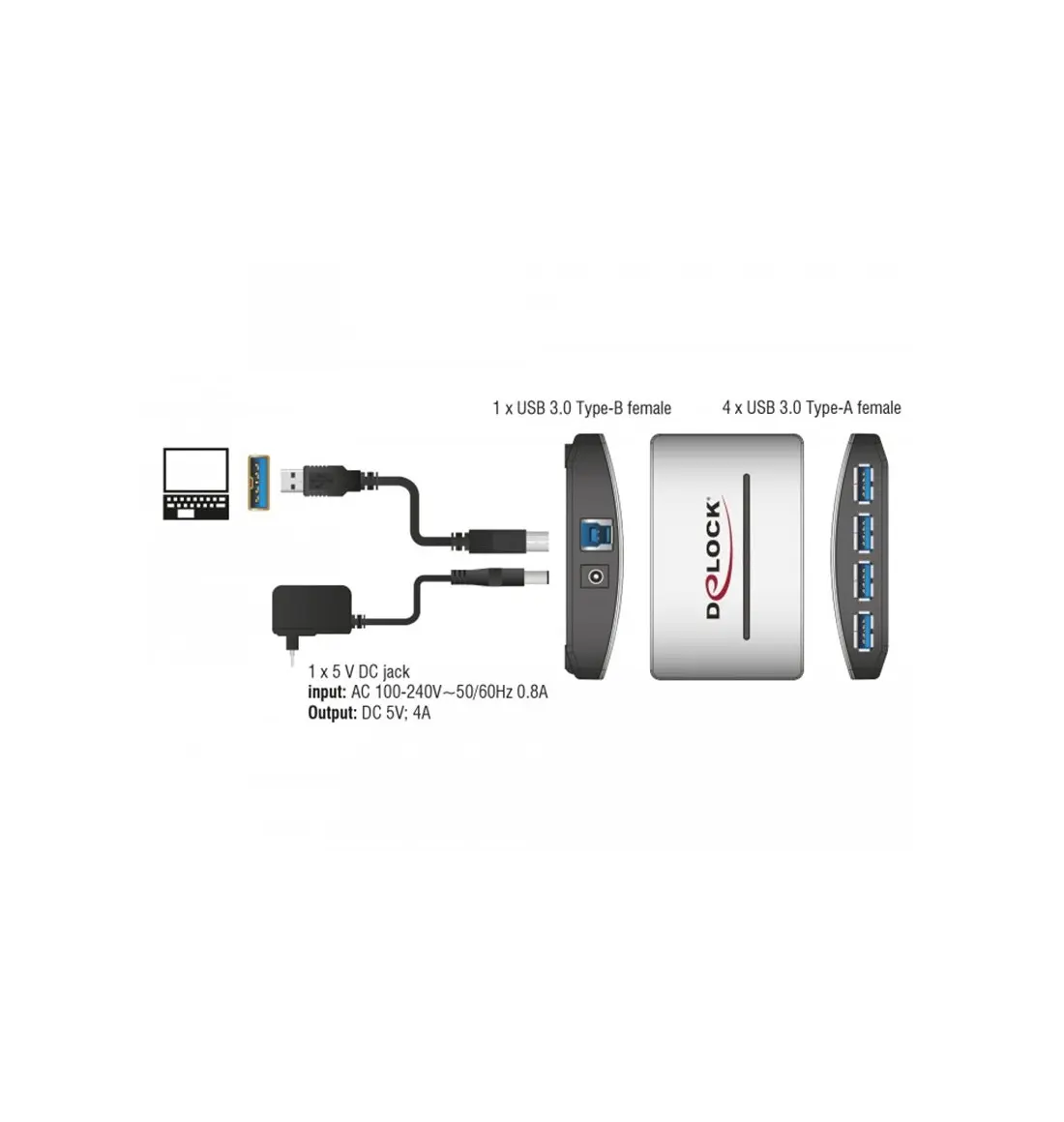 Este concentrador USB de Delock se puede conectar a un equipo a través de una interfaz USB Tipo-A. Amplía el equipo con tres conectores USB Tipo-A. Se pueden conectar diferentes dispositivos USB, como estaciones de acoplamiento, lectores de tarjeta, carcasas externas, etc.