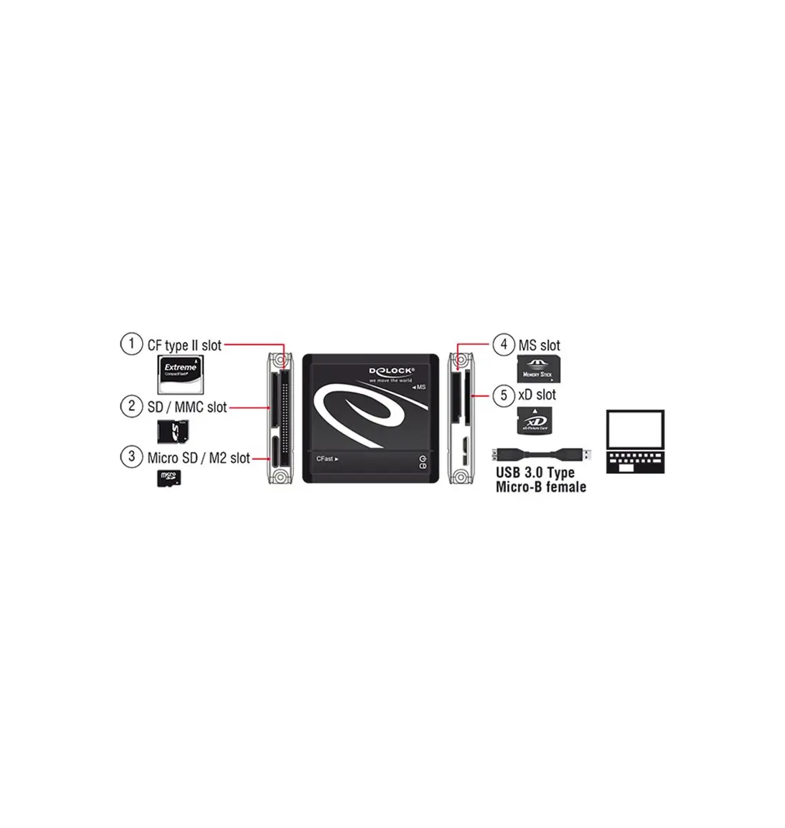 Este lector de tarjetas de Delock tiene cinco ranuras para tarjetas de memoria y permite realizar operaciones de lectura y escritura en numerosas tarjetas de memoria diferentes. El lector de tarjetas se puede conectar a un equipo de sobremesa o portátil mediante la interfaz USB Tipo-A.