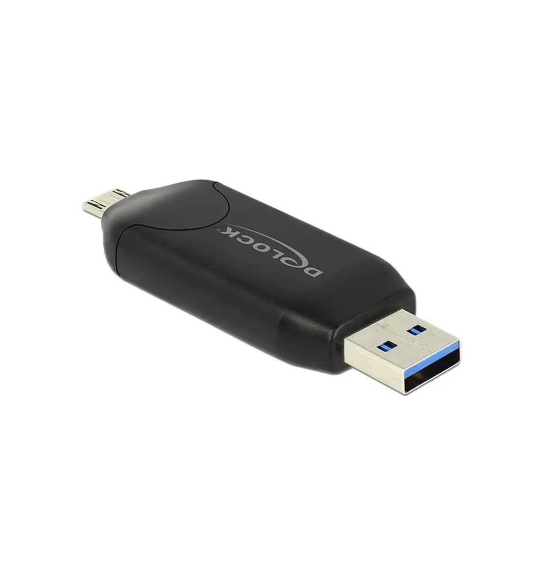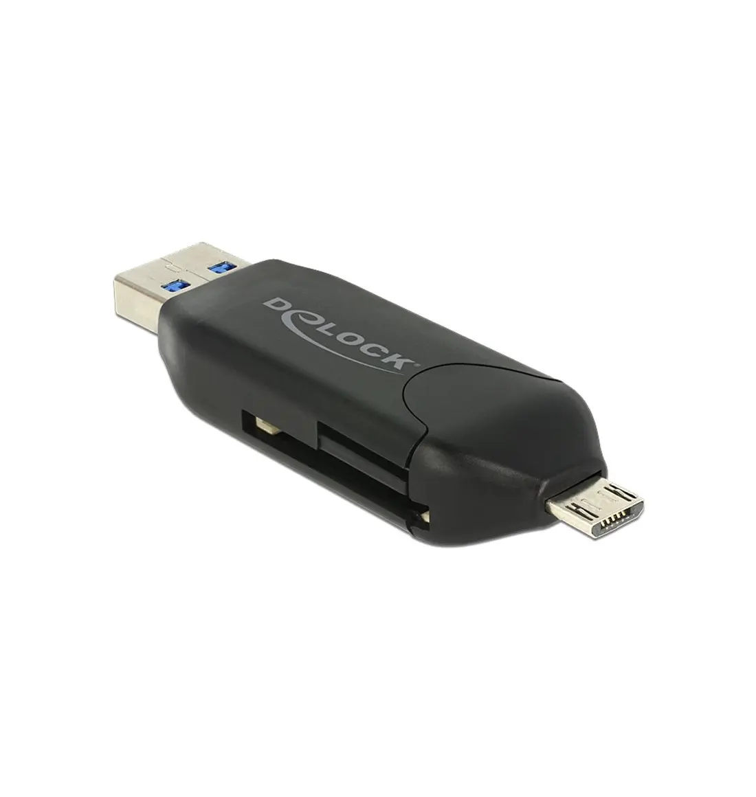 Este lector de tarjetas de Delock permite realizar operaciones de lectura y escritura en tarjetas de memoria a través del puerto OTG Micro USB de su teléfono inteligente o tableta. Además, puede utilizar el lector de tarjetas cómodamente en su PC.