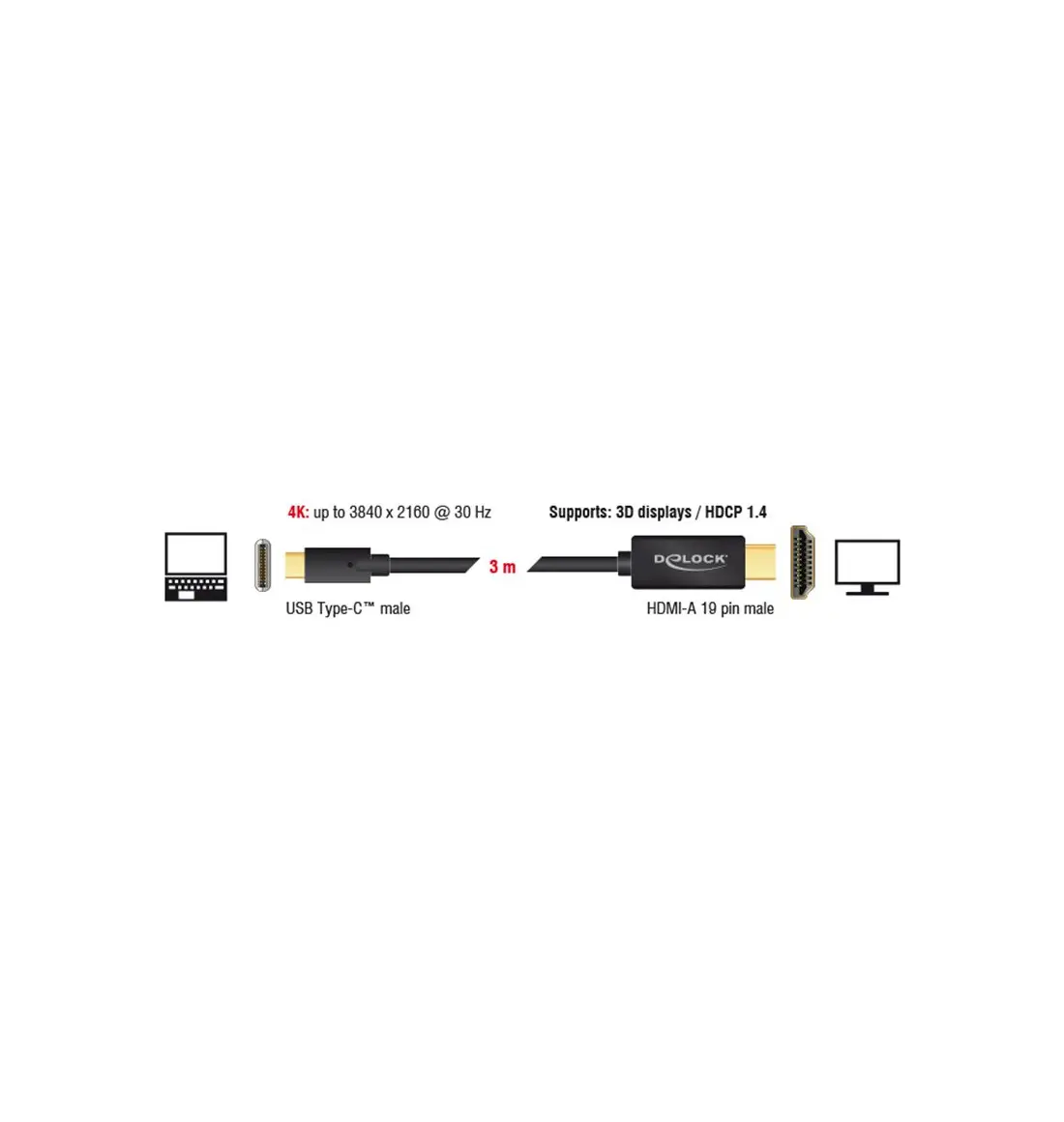 Este cable de Delock permite conectar un monitor HDMI a un equipo de sobremesa o portátil con un puerto USB-C™ o Thunderbolt™ 3, como un MacBook o Chromebook. La interfaz debe ser compatible con el modo alternativo DisplayPort.